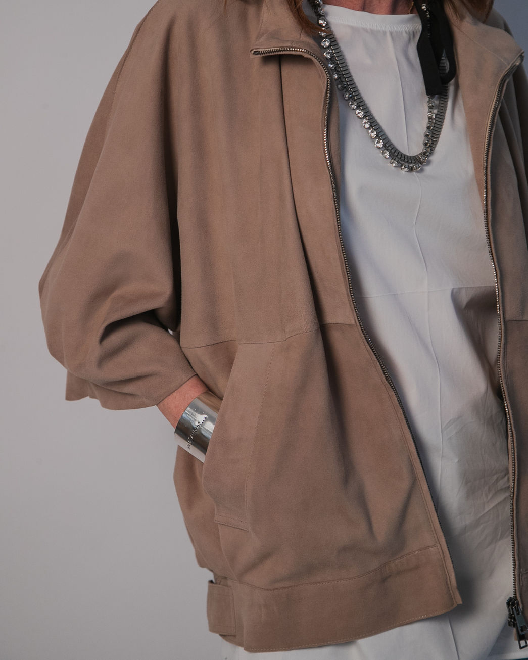 Giacca/cappa in pelle scamosciata colore sabbia.